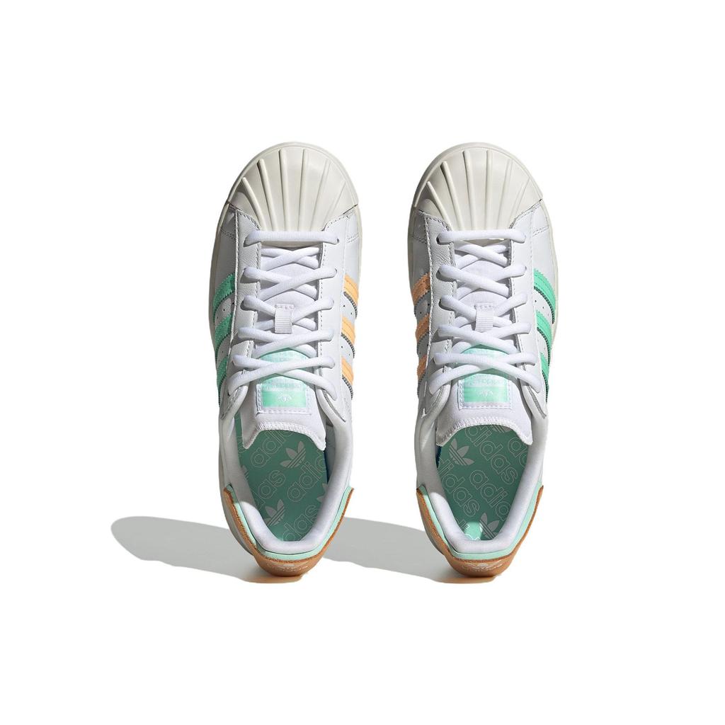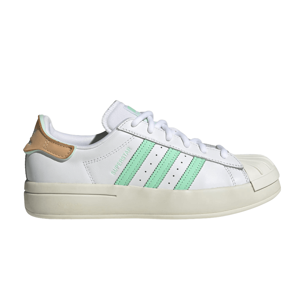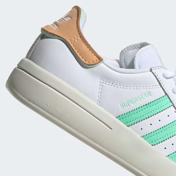 It features a smooth white leather upper that’s accented by a beige Three Stripes branding and hits of light green at the heel and tongue. Underfoot, is a chunky grey sole unit that’s packed with an ultra-comfortable EVA cushioning and a sturdy moulded EVA heel support.
